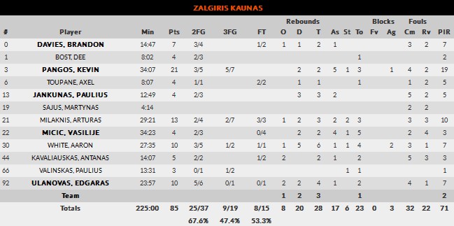 Pangos, el termómetro de Zalgiris. El base del conjunto lituano tuvo un comportamiento excelso en los tres primeros cuartos, y su equipo era feliz. Pero cuando bajó la aportación de Pangos, Zalgiris tuvo muchos problemas para anotar, y sólo el trabajo de Davies y White en segundas jugadas les permitía sumar durante el último cuarto y la prórroga.