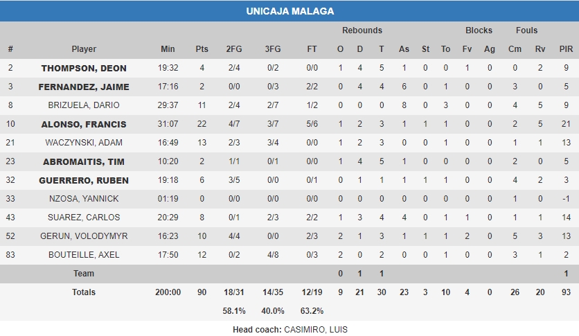 Destacamos la pareja formada por Troy Caupain (20 puntos, 3 rebotes, 3 asistencias y 25 de valoración) y Dylan Osetkowski (25 puntos, 3 rebotes, 2 asistencias y 7 faltas recibidas para 24 de valoración). Ambos fueron imparables para la defensa de Unicaja y sacaron muchos tiros libres (18 entre ambos) producto de penetraciones.