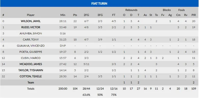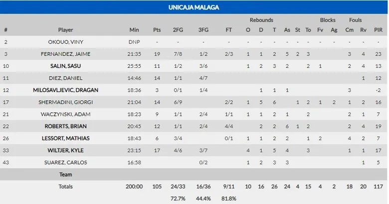62 puntos en la primera parte. Ante una cifra semejante no hay muchas más claves que buscar. Se pueden mirar otros números pero todos llevan a lo mismo: 12 de 22 en triples y 11 de 15 en tiros de dos. Es evidente que el acierto de Unicaja fue espectacular, pero también lo es que tuvieron tiros cómodos continuamente. De no haberse contagiado de la apatía defensiva de Fiat Turin, el partido habría quedado resuelto en la primera parte, pero recibir 48 puntos con 6 de 11 en triples y 13 de 19 en tiros de dos lo impidió.