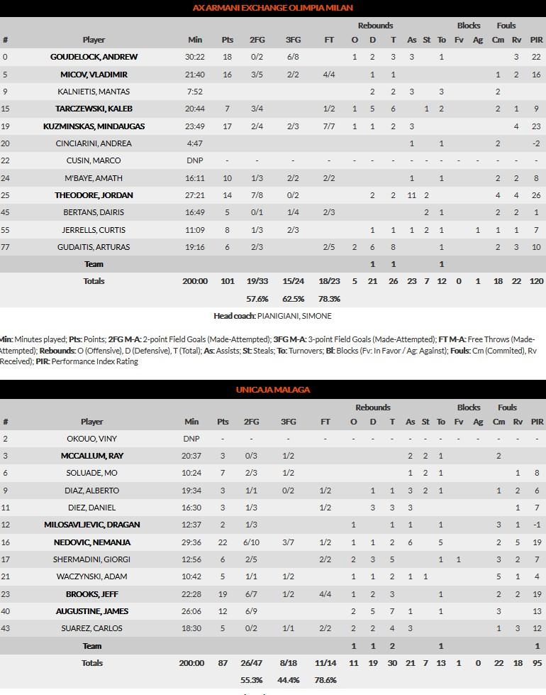Theodore abusó de los bases de Unicaja. El director de orquesta del Armani Milan campó a sus anchas por la pista, donde ninguno de sus parejas de baile pudo frenarle, sobre todo Ray Mc Callum, con el que coinció más minutos. 14 puntos y 11 asistencias en su haber, para 26 de valoración, totalmente opuesto a los números del base americano de Unicaja, que sumó 3 puntos y 2 asistencias para 0 de valoración.