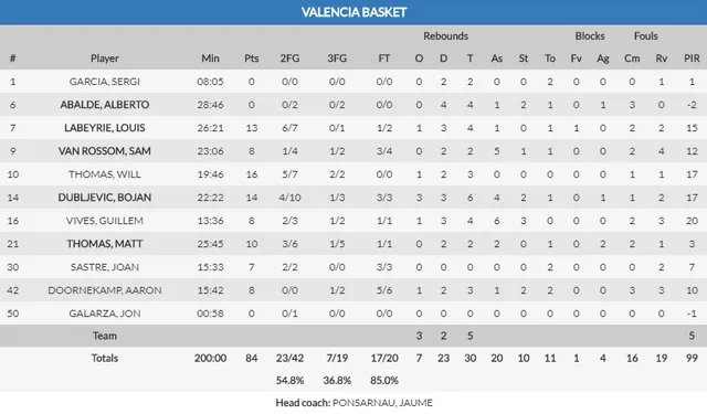- Aportación de los nuevos. El equipo en general no arrancó bien en el encuentro, y a Matt Thomas le costó afinar su puntería, al igual que le pasó a Labeyrie en sus primeras jugadas, pero con el paso de los minutos, ambos se convirtieron en elementos fundamentales del ataque de Valencia Basket. El americano se mantuvo como máximo anotador durante gran parte del partido, con 10 puntos hasta que Will Thomas predominó en los últimos cuartos y el francés fue clave en el tercer cuarto para que los suyos consiguieran poco a poco una cierta ventaja con sus puntos en la pintura, y acabó con una cifra nada mala de 13 puntos.