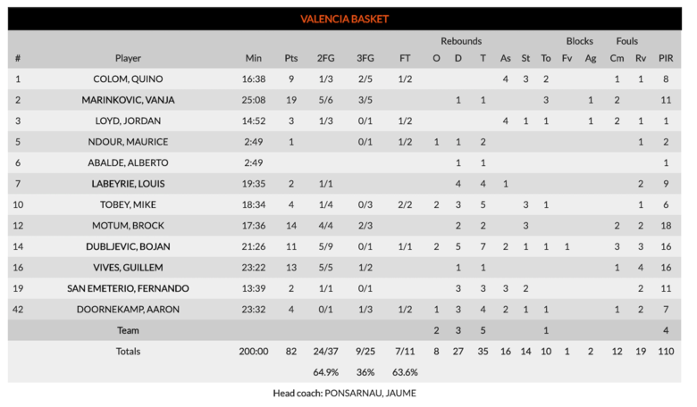 A falta de 3 minutos para el final Ponsarnau dio entrada a unos inéditos Abalde y Ndour con +26 para cerrar un partido redondo donde se pudo ver por fin la segunda unidad valenciana rendir como de ella se espera, más allá de Dubljevic y Loyd.