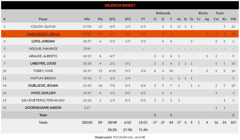 Quino Colom, Comidas para llevar: la principal característica del andorrano, como Jovic, es su capacidad para hacer jugar a los compañeros. Hoy ha dejado una de sus mejores muestras como taronja, capitaneando en todo momento la ofensiva valenciana y nutriendo una y otra vez a sus compañeros. Especialmente agradecidos estarán Mike Tobey y Bojan Dubljevic, que anotaron más de la mitad de sus puntos (entre ambos) asistidos por Colom. El equipo jugó al son que marcaba Quino, ofreciendo por momentos un juego rápido, alegre y muy vistoso. Terminó con 12 puntos y 11 asistencias, y saliendo victorioso del duelo ante Jovic, al menos por la victoria de su equipo.