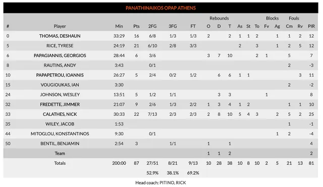 -Hasta donde llegó Calathes: Sorprende que un equipo con tanta calidad y una plantilla tan larga como la de Panathinaikos dependa en tanta medida de la aportación del base griego. Cuando estuvo en pista su equipo lo notó, y cuando no también para mal. Además sin su presencia sus compañeros tiene dificultades para encontrar el aro, a excepción de Rice.