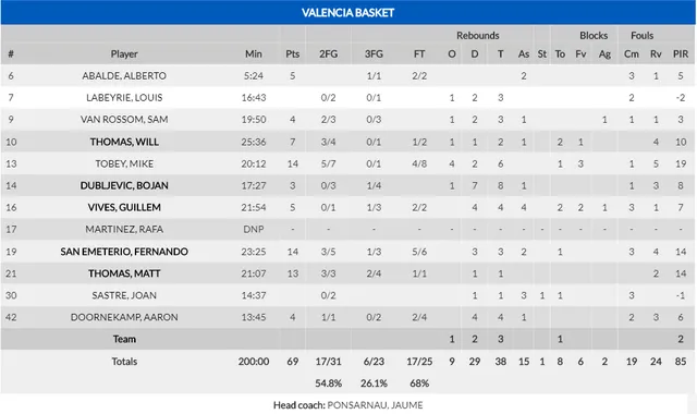 2- Tobey, San Eme y Matt Thomas, el trabajo importante. No fue un partido bonito de ver, faltó mucho baloncesto y acierto, y si Valencia Basket al final pudo contar una victoria fue por el buen trabajo de Mike Tobey bajo aros, el ritmo de juego impuesto por San Emeterio y por el acierto de Matt Thomas, que siempre aporta. 14 puntos para los dos primeros y 13 para el último, los tres claves en el partido.