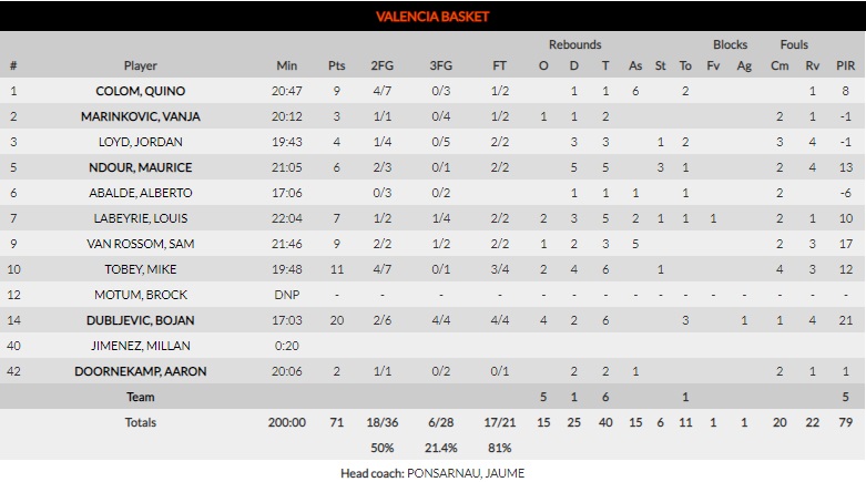 Costalazo en el 6.75. Tras la bacanal de la Fonteta 48 horas antes, los de Ponsarnau se dieron de bruces con la realidad. A pesar de los números de Dubi, Valencia no fue más allá del 21% desde más allá del arco. La imposibilidad de abrir espacios a la transición o al pick and roll hizo colapsar el juego visitante. El espíritu de Colom y Van Rossom para compartir el balón (11 asistencias entre los dos) fue en vano.