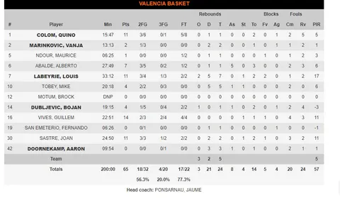 2- REMAR Y MORIR EN LA ORILLA. Valencia Basket se encontró durante todo el partido por detrás en el marcador. En ocasiones cerca y en ocasiones lejos. Salvó un momento crítico en el tercer cuarto, llegando a estar 14 puntos abajo. Se acerco en el último a 2 puntos, pero nunca llegó a culminar la remontada. Ir a contracorriente todo el encuentro y no llegar a liderar el partido para meter presión al conjunto local pudo ser clave.