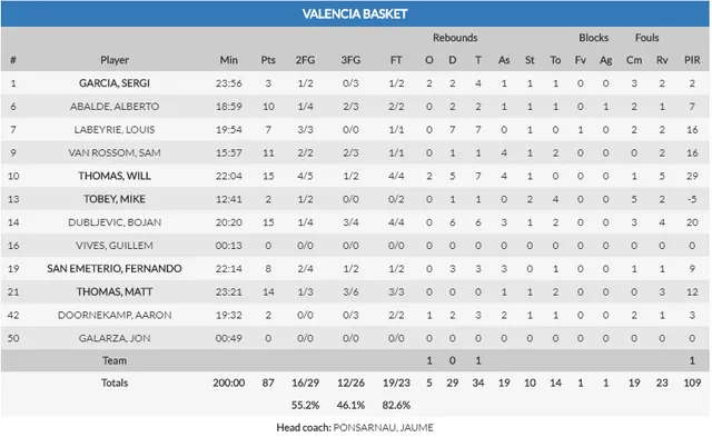 1. Tiro exterior. De nuevo, el mejor aspecto de Valencia Basket fue su decisión a la hora de tirar de tres y su acierto. Los valencianos fueron superiores, alrededor del 50 %, mientras que su rival estuvo a la mitad de ello. Pero no solo el acierto es el elemento clave, sino que los jugadores aciertan el momento justo en el qué se debe tirar de tres. Como en otros partidos, el tiro exterior fue decisivo para romper dinámicas, y Van Rossom y Dubljevic, junto a Matt Thomas, se convirtieron en los mejores baluartes de la zona de 6’75.