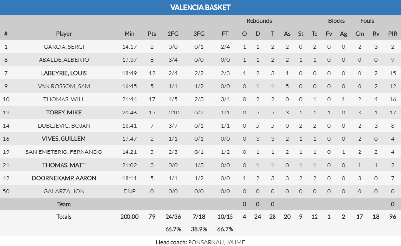 - Hombres interiores. El Valencia Basket se ha llevado esta victoria en parte gracias a los puntos de Louis Labeyrie, Mike Tobey y Will Thomas. Labeyrie tuvo gran importancia al comienzo del partido, Mike Tobey logró desatascar al equipo en el segundo cuarto y arrancar los momentos de mejor juego de los taronja y Will Thomas ayudó a sentenciar el encuentro entre el tercer y el último cuarto. Los dos primeros se han reivindicado y van cogiendo confianza en el equipo, con 12 y 15 puntos respectivamente. Y que decir de Will Thomas. El americano ha arrancado esta temporada a un gran nivel y se muestra decisivo en cada partido. Hoy volvió a ser el máximo anotador con 17 puntos.
