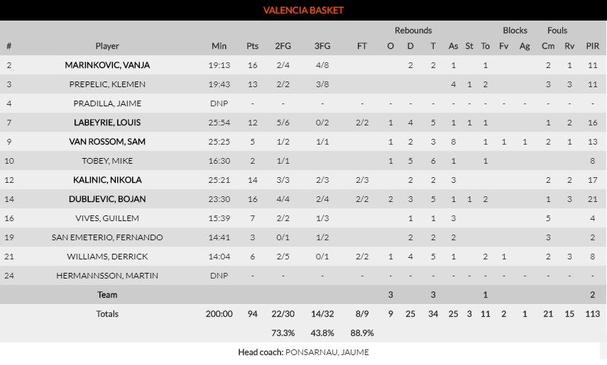 Esta victoria de Valencia Basket recuerda a otras conseguidas en esta temporada en las que varios jugadores demostraron tener un buen día y saber jugar entre ellos. La victoria estuvo sustentada por el buen hacer de Dubljevic, Marinkovic y Kalinic, los tres geniales en el tiro exterior. Pero no solo ellos. Labeyrie, Vives o Prepelic tuvieron números también casi perfectos en el triple, y Williams y Tobey ayudaron en el rebote. Un partido de notable para casi todos los que fueron de la partida hoy.
