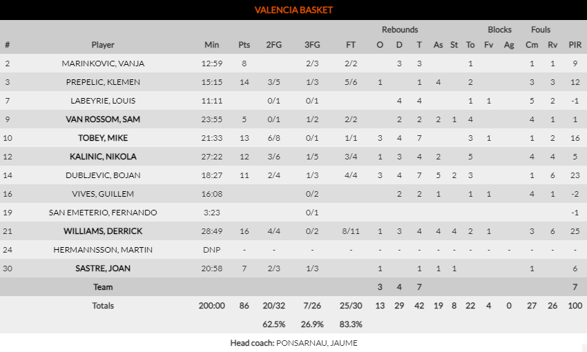 El más destacado en el partido fue Derrick Williams, que fue clave en los momentos decisivos y que además cogió el timón ofensivo y lideró a sus compañeros en ataque. El americano firmó una actuación de 16 puntos, 4 rebotes y 4 asistencias para 25 de valoración. Esto confirma el buen estado de forma que arrastra en los últimos partidos. Hoy, además, estuvo bien acompañado por Klemen Prepelic, Mike Tobey, Nikola Kalinic y Bojan Dubljevic. A Valencia Basket le respondieron sus jugadores más altos y contrarrestraron así el físico de Baskonia.