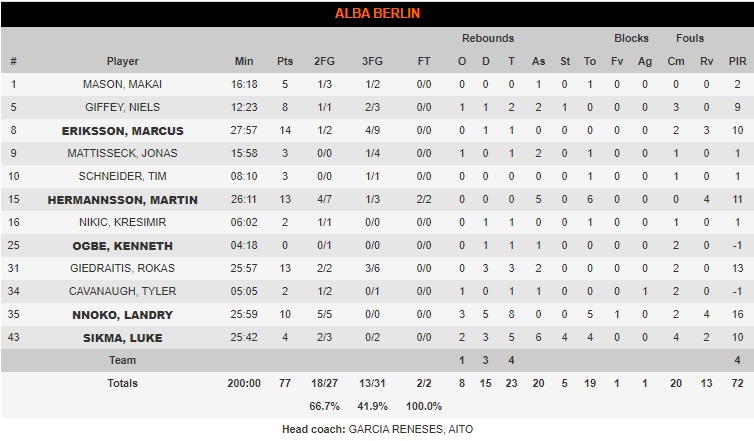 Clave 2. Más incisivos: Ponsarnau decisivo. Tras el descanso, el técnico de Tárrega facilitó a sus jugadores el camino directo hacia el aro. El cambio de paradigma encontró el resquicio definitivo en la estrategia enemiga. Loyd y Abalde se hicieron notar ante una rotación desfondada. La ausencia de Siva y la minutada de Hermansson o Giedraitis ahogó al Alba de Berlín en el cuarto decisivo. Van Rossom (11 asistencias) dirigió con acierto a los suyos.