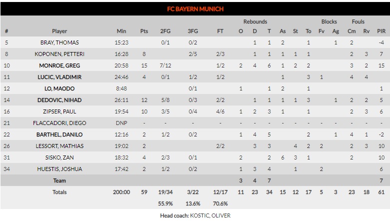 Colapso en el perímetro. El enorme potencial interior desplegado en el parqué muniqués no fue suficiente para lograr que la calidad general del juego fuera aceptable. El baloncesto moderno necesita del acierto exterior para convertirse en un espectáculo formidable. 3 de 22 (13%) para el cuadro de Oliver Kostic, inéditos además en la primera mitad. Afortunadamente, la puntería foránea creció en la reanudación y evitó el batacazo (10 de 31, 32%). No hubo un plan B más allá del juego de pies de Dubi. Tocó sufrir, y mucho. Esto sigue siendo la Euroliga.
