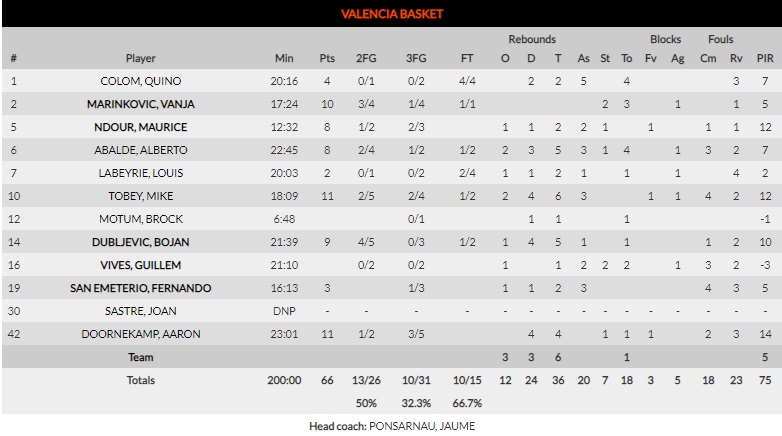Doornekamp, letal una vez más, selló por fin una distancia insalvable (52-60). A pesar de las infantiles pérdidas de balón, Dubljevic ya no sería necesario. Cuatro triunfos en los últimos cinco encuentros a domicilio (59-66). Valencia Basket continúa soñando, por méritos propios, con el Playoff europeo.