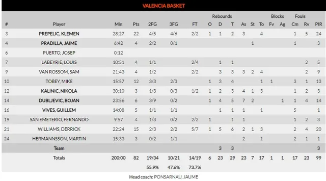 La irrupción en pista de Othello Hunter desbarató la solidez valenciana en el rebote. Las segundas opciones sujetaban el empuje foráneo, hasta voltear el marcador (25-26). La velocidad ganaba terreno en el ir y venir, escenario en el que los de Sfairopoulos se sentían más cómodos; provocaban en el rival más pérdidas de las habituales (17). De por medio, Prepelic y Wilbekin lideraban ya la faceta anotadora. 12 y 11 puntos respectivamente al paso por vestuarios. La conexión Van Rossom-Dubljevic dio el último estirón antes del descanso (43-37). El montenegrino, siempre sigiloso, estaba ya en 11 de valoración.