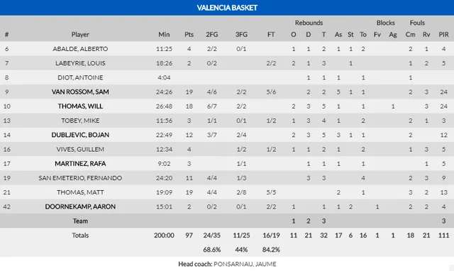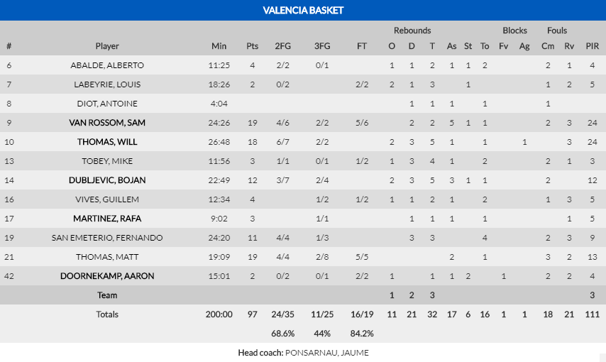 1- Sin Van Rossom no hay alma. Es sin duda el jugador con mejor forma de Valencia Basket. Sin él en pista, el equipo lo nota mucho. Y es que el base belga vuelve a estar al mejor nivel y se ha convertido en el jugador fundamental, tanto en el ataque como en la defensa, y el que da alma a este equipo. Hoy, 19 puntos, máximo anotador junto a Matt Thomas, y 5 asistencias, con una gran actuación que da una victoria a su equipo y la primera plaza del grupo. A destacar junto a él, los otros dos grandes nombres del conjunto de Jaume Ponsarnau: Bojan Dubljevic, con 12 puntos, pero que se marchó lesionado, y Will Thomas, con 18 puntos, y que vuelven a demostrar que es este el “núcleo duro”.