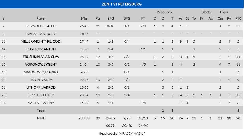 3- Reynolds, el revulsivo. Fue el gran protagonista desde el lado del Zenit de San Petersburgo, que cuando tuvo al jugador en buen momento, notó una mayor producción ofensiva, que les ayudó a entrar en el partido. 21 puntos fue los que anotó, para ser el máximo anotador del encuentro. Pero no fue suficiente, y solo Trhuskin, con 17 puntos, aportó a su altura, aunque Valencia Basket fue superior durante muchos momentos, lo que evitó que los rusos se vieran con grandes opciones de victoria en la Fonteta.