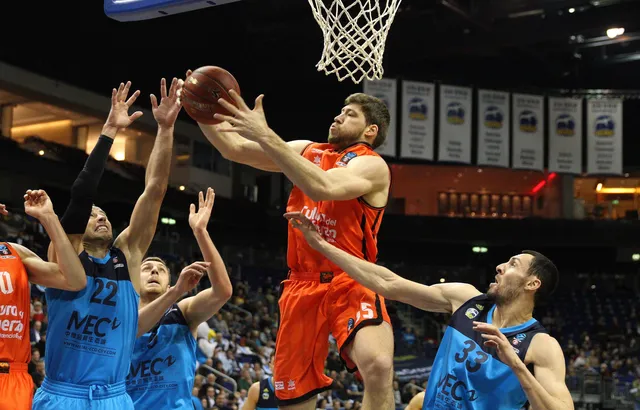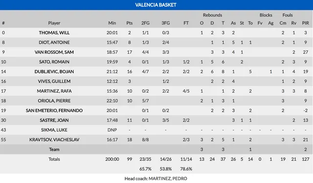 Recuperando sensaciones: En vista de que a los alemanes no les apetecía jugar más, Pedro Martínez probó cosas nuevas jugando con dos bases y dos pívots en pista. Precisamente fueron Kravtsov y Van Rossom los máximos anotadores del partido, uno destrozando el aro en la pintura y el otro con bastante acierto en el triple y recuperando sensaciones en las penetraciones que hasta antes de la lesión habían sido su principal arma ofensiva. El último cuarto se convirtió en un corre calles en el que solo Sato se tomaba en serio la defensa y el ataque. La única incógnita era si los taronja llegarían a la centena, no obstante se quedaron a un solo punto y Vives decidió no hacer más sangre por lo que el partido terminó 73-99 haciendo así al Valencia Basket el mejor primero de todos los grupos por lo que dispondrá de ventaja d campo en todas las eliminatorias.
