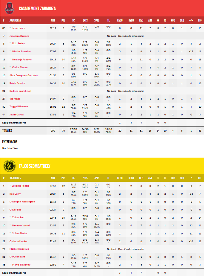 Falco Szombathely quería que esa apatía vivida a lo largo del encuentro se terminase rápidamente, así que despertarían de un largo letargo para no sólo poner contra las cuerdas a Casademont Zaragoza, sino para ponerse por delante en el marcador y llevar la manija del encuentro. Por más que los minutos pasasen, se veía un intercambio de golpes entre ambos equipos que no auguraba nada positivo para los intereses locales pero, a falta de 2 minutos para el final, cuando la idea de la derrota se encontraba más cercana que nunca, la defensa zaragozana despertaba para realizar varias acciones de mérito y podía de nuevo empatar el partido. Las últimas acciones del partido estuvieron protagonizadas por Radovic y por Perl, llegando los maños a ganar a falta de 4.8 segundos del final y que, tras una excelente defensa, lograrían que la victoria por la mínima se quedase en la capital maña y así poder celebrar un nuevo triunfo en un partido muy espeso y muy complicado.