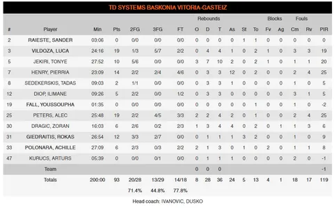 La aparición en el partido de Luca Vildoza fue crucial para hacer reaccionar a su equipo. El base argentino completó un encuentro fantástico, tomando buenas decisiones en ataque y estando muy acertado en defensa. Con cinco de siete en triples y diecinueve puntos en su casillero lideró a su equipo hacia otra importante victoria en Euroliga. Tampoco podemos obviar la actuación de Alec Peters con un gran acierto desde el triple (⅘) y la gran irrupción de Pierria Henry en la segunda parte; aportando catorce puntos y doce asistencias.