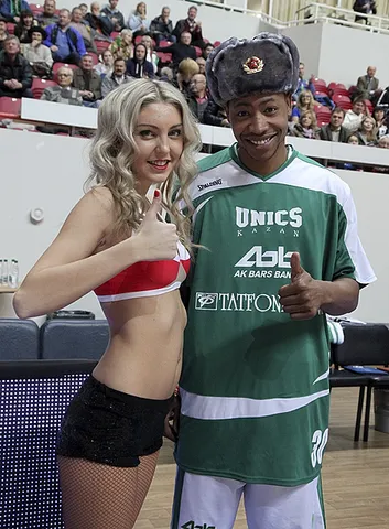 ¡Qué poco ha tardado Goudelock en adaptarse al frío de Kazan! Esta foto ha sido señalada por la propia competición como imagen de la semana. Parece que no le cuesta mucho posar al exterior norteamericano con el sombrero y la cheerleader de su equipo antes de saltar a la pista a marcarse 21 puntos y un 10/15 en tiros de campo. Parece adaptado al equipo y a la ciudad.