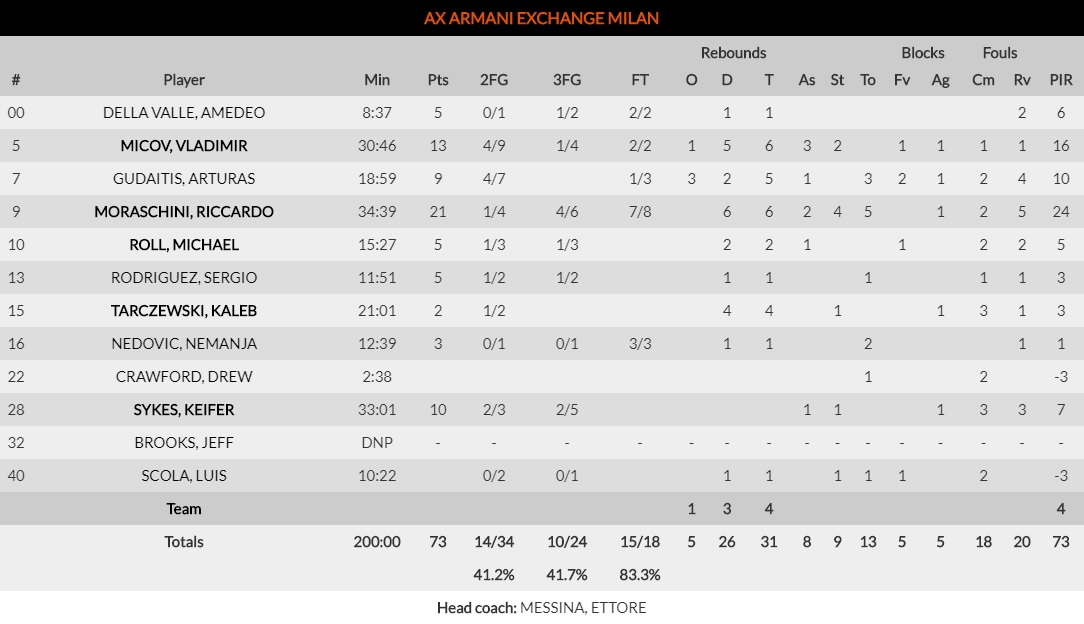 Tras el arreón blanco, Armani Milán tiró también de coraje y trabajo, sin perder la concentración y manteniendo el movimiento de balón del primer cuarto. Un entonado Riccardo Moraschini desde el triple (3/4 T3) y sus 15 puntos volvieron a dar un pequeño colchón a los suyos al término de la primera parte (45-35).