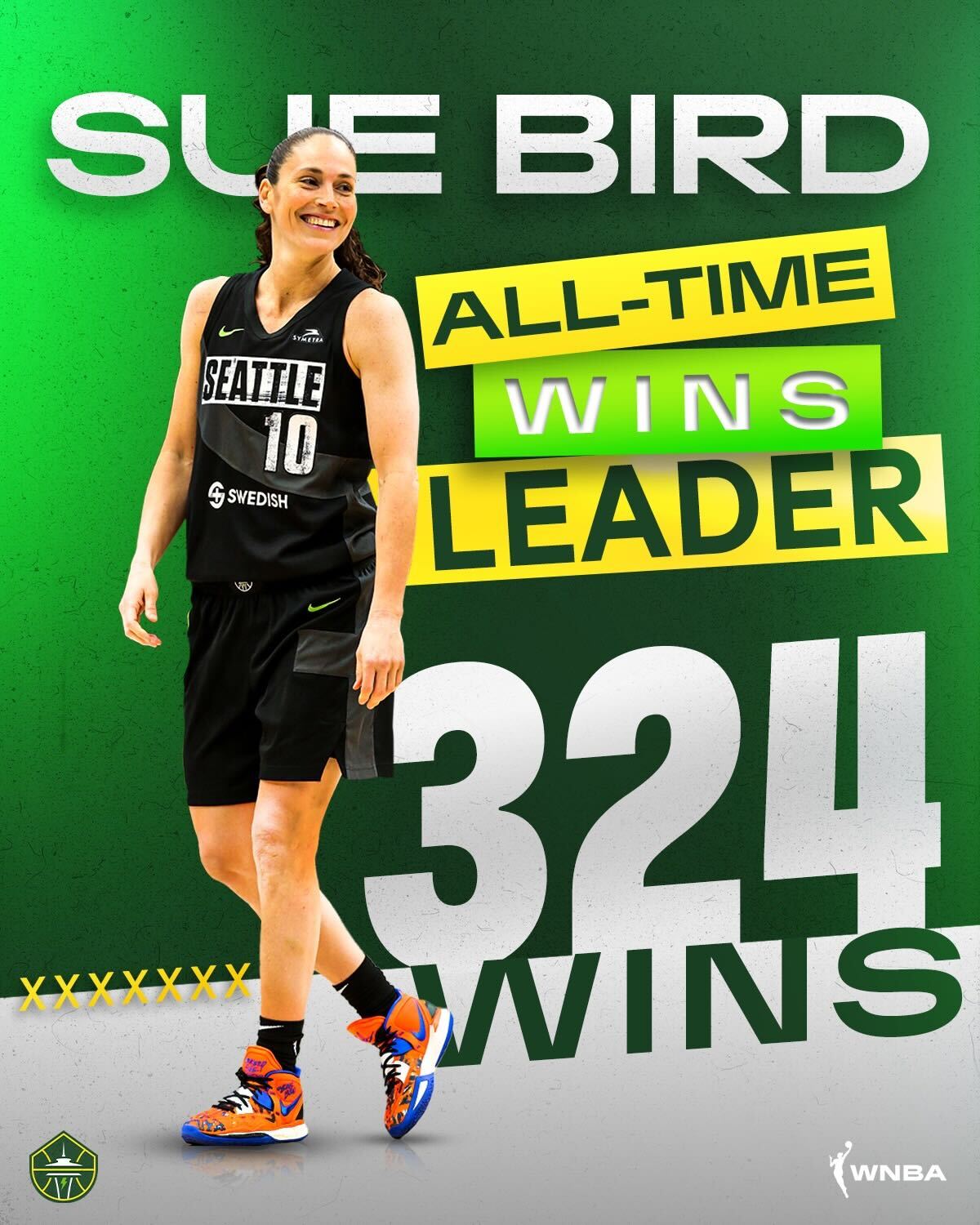 Sue Bird se convierte en la jugadora con más victorias en Regular Season 324, pero Lindsay Whalen es la jugadora con más victorias entre temporada regular y playoffs con 377, quedándose Bird en 355.