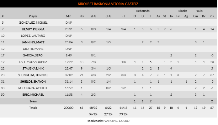 ‘Youssoupha Fall, el renacido: Siguiendo con la cinematografía, la pelicula ‘El Renacido’ fue frotagonizada por el prestigioso Leonardo Dicaprio, sin embargo, esta noche bien podría haber sido Youssoupha Fall el actor principal de esta película. El pivot senegalés culminó una gran noche mucho tiempo después. Baskonia añoraba la mejor versión de Fall, esa que demostró a principio de temporada, esa que le convertía en un pivot diferente e imparable, como ha sido hoy. Pese a los 37 puntos de valoración de Shengelia, Fall ha sido el mejor jugador de Baskonia en el día de hoy sin discusión alguna, siendo el faro que guiaba al equipo en ataque y el arnés que lo sujetaba en defensa. La única gran noticia para el conjunto alavés esta noche.