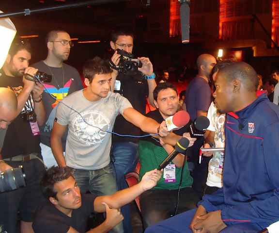 Solobasket.com, con la ayuda de nuestro compañero de marca.com Pablo Egea (cámara en mano para acompañar nuestro alámbrico), tuvo la oportunidad de hacerle varias preguntas a un Kevin Durant que aun intenta familiarizarse con los medios. Se le escapó algún bostezo que tal vez alguno de nosotros le contagiamos por aquello de que el reloj marcaba poco más de las 8. No obstante, el chaval fue muy amable y sincero ante las preguntas que le formulamos. El coach K afirmó que “es nuestro mejor jugador y es un trabajador incansable, cuando llegamos al entreno el ya lleva mucho tiempo allí” y Rajon Rondo, quién hizo un intento fallido por driblarnos para esquivar su paso por nuestros micrófonos, añadió también en defensa de tantas y tantas dudas que son lanzadas sobre su combinado nacional que “tenemos a uno de los mejores anotadores de la NBA”. Durant dice que se ha hecho así mismo con “dedicación”, un buen entorno y “mucho trabajo”. Bromas a parte, sin duda el chico es un ejemplo a seguir.