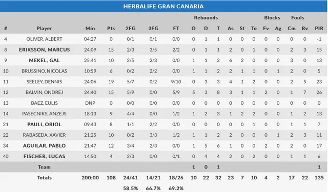 Opciones: 14 de 21 en triples (11 de 15 en la primera mitad) y casi un 60% en tiros de dos. Partido plácido para un Herbalife que llegaba con muchas dudas y que afronta este tramo de la competición con otra mentalidad, después de esta victoria. Partidazo de Seeley, con 19 puntos, 3 rebotes y 4 asistencias, y buena segunda parte de Balvin, clave para cortar la reacción de los turcos. Con esta victoria fuera de casa, cimentada en un nivel ofensivo espectacular, los de Casimiro consiguen su primera victoria fuera de casa en el Top 16. El doble enfrentamieno Darussafaka Alba, puede beneficiar al Herbalife, en caso de volver a ganar al Galatasaray, que jugará en el Gran Canaria Arena la próxima semana.