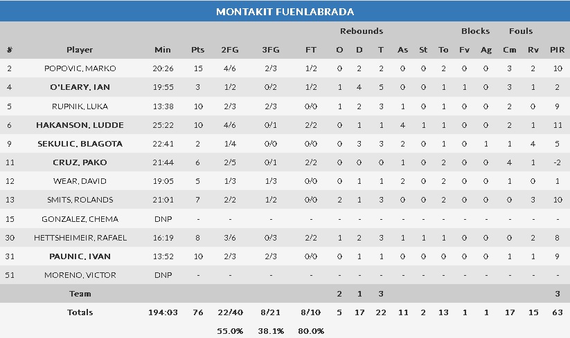 El Granca, a cuartos: Un parcial de 0 a 10 (del 74-54 al 74-64) en un dos minutos de inspiración de Popovic y David Wear , volvieron a dar vida al Fuenlabrada que estaba noqueado, demostrando una gran capacidad de reacción y dejando claro que este partido era una auténtica final para ambos. Los amarillos lograron atemperar los nervios a pesar de que otro triple, esta vez de Smits, redujo la diferencia hasta los siete puntos. Con el liderazgo de O'Neale, la anotación interior de Hendrix y una mayor concentración defensiva, anularon la reacción del Fuenla. Los jugadores del Granca consiguieron tener un final plácido para un partido de suma importancia y logran meterse en los cuartos de final, acabando el Top 16 con cuatro victorias seguidas y ahora les espera el Hapoel Jerusalem de Amare Stoudemire, con el factor cancha en contra.