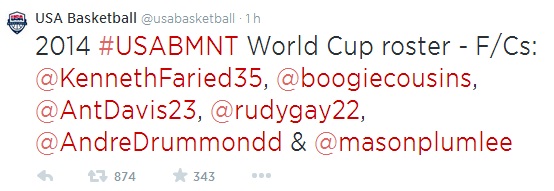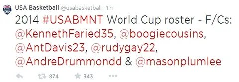 Tras su partido contra Puerto Rico (112-86), 4 horas después, la federación norteamericana ha dado a conocer la lista definitiva de EE UU para la Copa del Mundo de baloncesto. Estos serán los definitivos que asitirán a España para luchar por la medalla de Oro y repetir el título conseguido en 2010. Si lo consiguen, será la primera vez que el combinado norteamericano consigue dos Mundiales consecutivos.