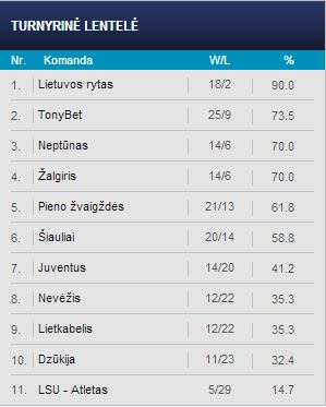 La competición regular ha llegado a su fin en Lituania. 32 fechas (Rytas, Zalgiris y Neptunas han jugado 20 partidos por los 34 que han disputado el resto de conjuntos) para dilucidar las posiciones y cruces de playoffs. A excepción del primer puesto, que desde hace varias semanas tenía dueño, Rytas, el resto de la tabla estuvo sujeta a variaciones hasta el último momento.
