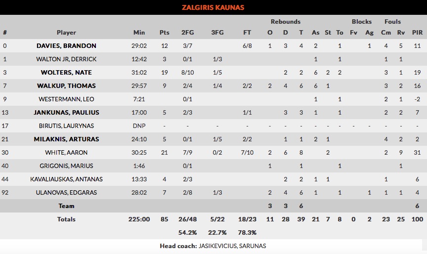 2. Zalgiris sigue sin conocer la victoria como local. Los de Jasikevicius estuvieron cerca en muchos compases del partido, pero en todo momento fue a remolque en el marcador. Brandon Davies se apagó demasiado pronto -aunque se activara al final del partido-, Aaron White fue insuficiente y la doble W exterior (Wolters y Walkup) no fue muy constante, sino que iba a rachas. Pelearon y llevaron en volandas al Zalgirio Arena allá por el tercer cuarto y sobre todo al final del cuarto periodo, cuando el conjunto lituano creía más que nunca en la remontada, pero esta remontada no se materializó y el show de White (21p, 8r, 31val) se quedó en nada.