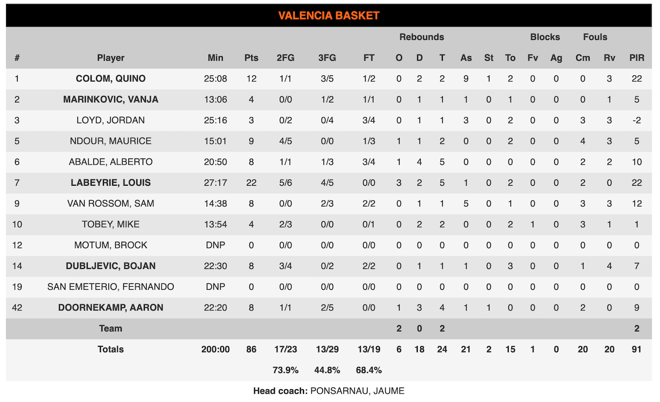 Sin embargo hoy la segunda unidad de Valencia apareció y en el caso de Labeyrie de que manera. Muy acertado en el tiro exterior y aportando en todos los ámbitos. Destacar también la aportación de Ndour y por momentos de Abalde.