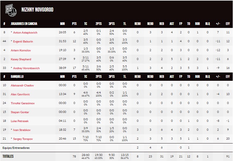 Nizhny Novgorod demuestra su talento ofensivo desde el inicio. El primer cuarto de los rusos fue un espectáculo ofensivo. Vorontsevich abría el campo para que Toporov aprovechara los huecos en la zona para abrir con un 5 a 0. En cuanto la defensa maña se cerró más, los de Novgorod encadenaron tres triples seguidos para seguir aumentando las ventajas (14-7). Casademont despertó de la mano de Brussino, que encadenaba puntos y asistencias por igual, pero sus rivales seguían sin fallar en ataque y anotaban de todas las maneras posibles, a pesar de que Shepherd se quedaba sin anotar en sus cinco primeros minutos. Gavrilovic sustituía a Toporov como gran arma en la zona y entre los dos pívots sumaban 14 puntos para los ruso. Sin la aportación de su principal arma ofensiva, Nizhny firmaba 28 puntos en estos diez primeros minutos con una gran carta de tiro de 4 de 8 en triples y 6 de 10 en tiros de dos. Los maños intentaban seguir el ritmo con 23 puntos.