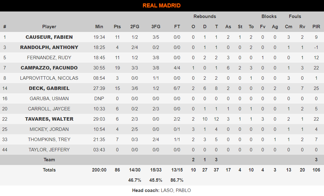 Acostumbrados a Gabriel Deck: Silencioso y tranquilo, el alero argentino volvió a ser el mejor del partido en una actuación sólida y con muy pocos errores. Intenso y agresivo en defensa, su aportación en el rebote y en la anotación volvió a ser clave. Cerró el encuentro con 15 puntos, 8 rebotes, 7 faltas recibidas y 25 de valoración.