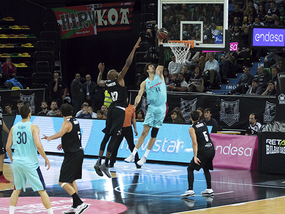 Comenzaba el partido con un Barcelona contundente y con las ideas muy claras, cargando el juego interior con un Kevin Seraphin descomunal, que dominaba la zona a placer. Los Hombres de Negro no conseguían frenar a los jugadores blaugrana, que marcaban el ritmo de partido. Solo la entrada en cancha de Álex Mumbrú, que cumplía su partido 650 en la Liga Endesa, conseguía reactivar la energía bilbaína e impedir el desastre (15-29). Los de Sito Alonso imprimían un ritmo altísimo al juego y hacían mucho daño a los locales, que les veían imponerse con comodidad. Tiraba de casta Álex Mumbrú, para dar la cara por los suyos, pero no conseguían reducir distancias los bilbaínos. Los Hombres de Negro trataban de mejorar su defensa, pero el acierto exterior de los blaugrana complicaba las cosas para los bilbaínos (36-55).