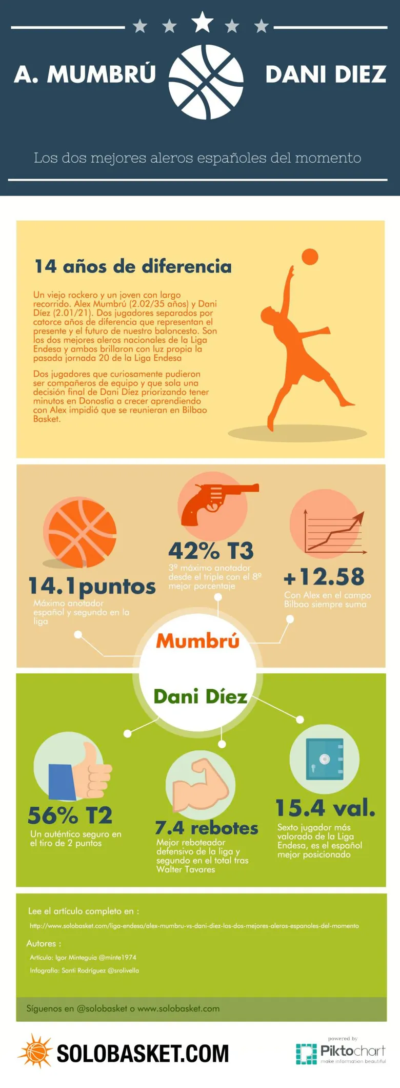 Un viejo rockero y un joven con largo recorrido. Alex Mumbrú (2.02/35 años) y Dani Díez (2.01/21). Dos jugadores separados por catorce años de diferencia que representan el presente y el futuro de nuestro baloncesto. Son los dos mejores aleros nacionales de la Liga Endesa y ambos brillaron con luz propia la pasada jornada: Dani Díez se fue hasta los 32 puntos con 6 triples en la victoria de Gipuzkoa Basket en la difícil cancha del MoraBanc Andorra y fue, con 37 de valoración, el MVP de la Jornada 20. Por su lado, Alex Mumbrú no se quedó atrás, sumó otros tantos triples para 24 puntos anotados en el triunfo de Bilbao Basket ante la Bruixa d'Or Manresa. El capitán de los MIB encadenaba así su quinto partido consecutivo con 20 o más puntos anotados, convirtiendo nada menos que 24 triples de 44 intentos en ese tiempo. Dos jugadores que curiosamente pudieron ser compañeros de equipo y que sola una decisión final de Dani Díez priorizando tener minutos en Donostia a crecer aprendiendo con Alex impidió que se reunieran en Bilbao Basket.