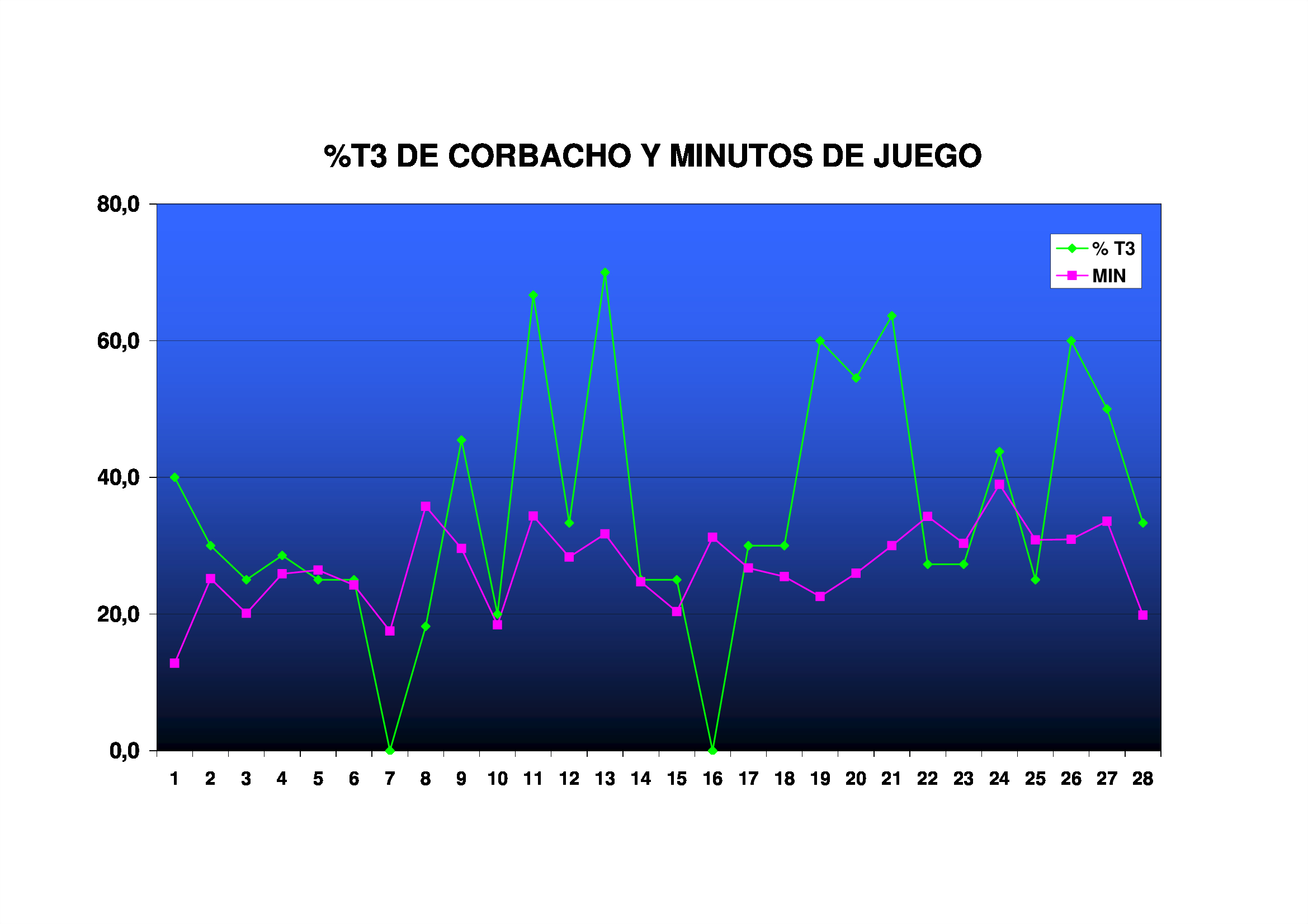 - Véase además, que analizando la temporada del jugador, parece existir cierta relación entre la serie de minutos y la serie de % de tiros de 3