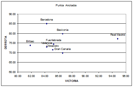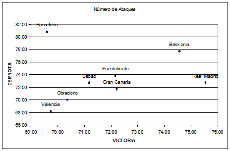 - Esta última cuestión vuelve a aparecer si consideramos el número de ataques disfrutados por partido (pinche en este enlace para ver la diferencia entre ataque y posesión). Además, se puede ver que el Valencia es el equipo con ritmo más lento de todos los participantes. Es el que menor número de ataques juega ya sea en victoria o en derrota (tengamos en cuanta que sólo ha perdido un partido). Esta cuestión contrasta con la información dada en la web de la ACB, donde destacan que "si algo caracteriza a Valencia Basket es su alto ritmo de partido". Parece ser que el rodillo taronja no es tan rodillo.