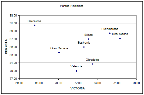 - De igual forma, todos los equipos reciben más puntos cuando pierden, llamando enormemente la atención el caso del F.C. Barcelona, el cual recibe una media de unos 70 puntos cuando gana y de unos 90 cuando pierde. Si tenemos en cuenta que este equipo anota lo mismo cuando gana o pierde (primera gráfica), ¿podríamos decir que el F.C. Barcelona basa sus victorias en la defensa?