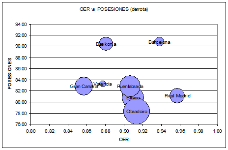 En las siguientes gráficas se representa los puntos anotados por posesión y el número de posesiones jugadas. El tamaño del círculo representa el número de partidos disputados en cada una de las situaciones consideradas: victoria y derrota. Se puede observar que: