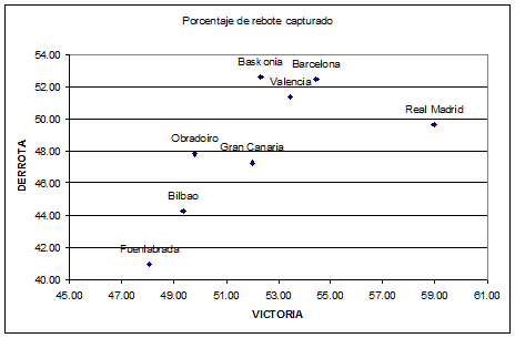 Sin duda, una de las claves para controlar un partido y conseguir la victoria final es el rebote. A partir de las siguientes representaciones gráficas tenemos que los equipos más poderosos en el rebote son Baskonia, F.C. Barcelona y Valencia, los cuales ganan el rebote (capturan más del 50% del rebote posible) tanto cuando ganan como cuando pierden. En el otro extremo tenemo a Obradoiro, Bilbao y Fuenlabrada. Equipos que pierden el rebot incluso cuando ganan el partido. Por otro lado, Real Madrid y Gran Canaria ganan el rebote cuando ganan el partido y lo pierden en caso de derrrota. Finalmente, si bien el Fuenlabrada es el que menos porcentaje de rebote defensivo captura, cuando gana el partido es el segundo que más rebote ofensivo captura detrás del Real Madrid.