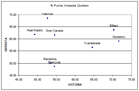 Para finalizar analizaré la anotación de cada quinteto dependiendo de si se gana o no el partido. Cuando ganan el partido, los quintetos de Real Madrid y Gran Canaria anotan menos que cuando pierden. En el otro extremo están Bilbao y Obradoiro, cuando ganan su quinteto inicial anota un mayor porcentaje de puntos del total del equipo que cuando pierden.