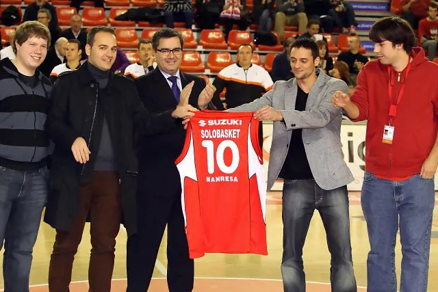 Tras el homenaje de Selección Española, el Assignia Manresa ha sido el siguiente club en reconocer la trayectoria de Solobasket.com haciendo entrega, de la mano de su presidente Josep Vives, de una camiseta conmemorativa del equipo catalán exhibiendo el número l0 y el nombre del portal. Jaume Ponsarnau no dudo en darnos un fuerte abrazo y felicitarnos cuando pasamos junto a su banquillo a pesar de la tensión prepartido.