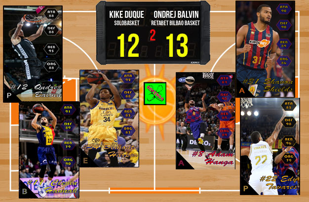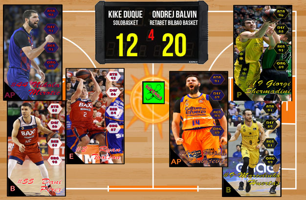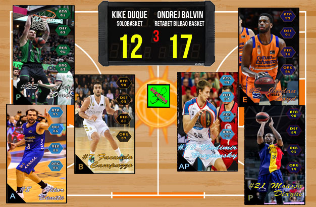 Segundo encuentro de la semana con viaje hasta el País Vasco para vernos las caras ante uno de los equipos revelación de la temporada. Ondrej Balvin será el hombre de negro encargado de defender los intereses de RetaBet Bilbao Basket en esta batalla de cartas con la dificil misión de revertir las tres derrotas seguidas del bando de jugadores. Hasta ahora, Solobasket va dominando la clasificacíon con cinco victorias (Javi Vega (San Pablo Burgos), Edu Durán (UCAM Murcia), Beqa Burjanadze (Herbalife Gran Canaria), Álvaro Muñoz(Monbus Obradoiro) y Tyson Pérez (MoraBanc Andorra) frente a las dos victorias de los jugadores de la Liga Endesa (Guillem Colom (MoraBanc Andorra) y Dani Pérez (BAXI Manresa)).