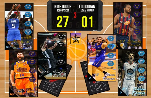 Paso por vesturarios y reanudamos el partido con un duelo de estrellas. Edu Durán forma tridente con Vitor Benite (353 puntos), Shavon Shields (355) y Dejan Kravic (360) utilizando la carta de Apoyo PIZARRA para plantar batalla con 1089 puntos. Kike Duque elige a Bojan Dubljevic (363), Earl Clark (359) y Ondrej Balvin (359) utilizando también la carta de Apoyo PIZARRA para sumar 1102 puntos. El cuarto se lo lleva de nuevo Kike Duque por 13 puntos (1102 – 1089 = 13) yéndose al último cuarto con una importante ventaja de 26 puntos (27 – 1).
