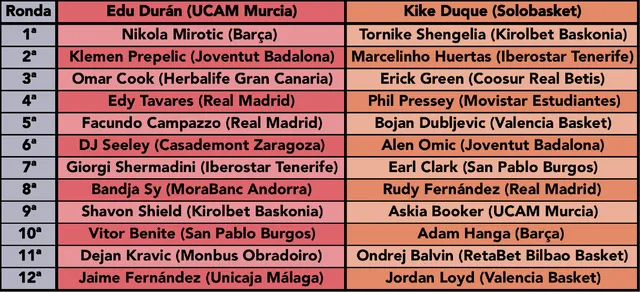 Comenzaremos el duelo con la elección de jugadores vía Draft en el que, como ya es costumbre, comenzará eligiendo jugador el invitado de honor: Edu Durán.Una vez Edu haya elegido a su primer jugador, Kike elegirá su primer pick, pasando de nuevo el testigo a Edu y así sucesivamente hasta completar el roster de jugadores. Recordamos que las plantillas tiene que contar como mínimo con dos jugadores por posición (base, escolta,…) quedando dos puesto en el roster libres que se podrán completar con jugadores de cualquier posición: