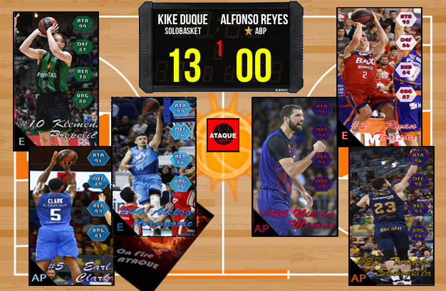 Pitido inicial y pasamos al juego ofensivo. Alfonso Reyes arranca el partido con Nikola Mirotic (98 en Ataque), Tornike Shengelia (96) y Ryan Toolson (98) mientras que Kike Duque forma con Klemen Prepelic (99), Aleksa Avramovic (94) y Earl Clark (91); completando su tridente con la carta de Apoyo ON FIRE. Los primeros puntos del partido se van para el bando Solobasket (305 – 292 = 13) colocando un marcador de 13 a 0 de inicio.